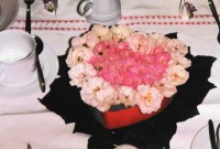 Für das Blumengesteck verwenden wir eine Herzdose. Es können auch Formen genommen werden. Den Steckschwamm zuschneiden, wässern und mit einzelnen Röschen bestecken (sind die Stiele zu weich, müssen sie mit Draht umwickelt werden). Es eignen sich dafür alle Schnittblumen. Die Blüten sollten allerdings nicht zu groß sein. Die fertige Schale auf große Efeublätter stellen.