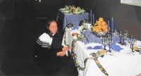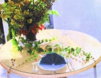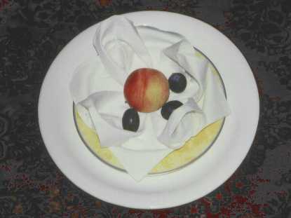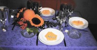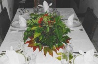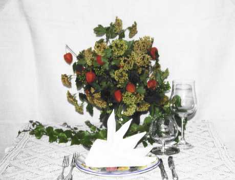 Die Dekoration besteht aus einer weißen, großen Kuchenplatte, zwei Sonnenblumen, einer Honigmelone, Farn (beliebiges Grün aus dem Garten) und Ebereschenzweigen. Dieses Arrangement hält auch ohne Wasser einen ganzen Tag. Die Servietten werden als "Smoking-Hemd" gefaltet und mit Schleifchen versehen. Faltanleitung: Smoking-Hemd.