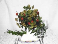 Buchsbäume: Einen schöner Übertopf mit Steckschwamm auskleiden, einen Kegel aus Steckschwamm zuschneiden, mit einer Heißklebepistole auf den Topf kleben. Einen Bambusstab zuschneiden, von der Spitze bis zum Boden durchstecken. Buchsbaum in 4 cm große Stücke schneiden und den Kegel damit bestecken. In gleichmäßigen Abständen kleine, rote Glaskugeln und seitlich eine rote Schleife stecken. Die Spitze mit einer größeren roten Glaskugel dekorieren. Den Tisch mit Efeublättern, Perlenschnüren und roten Schleifchen verzieren.