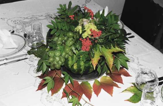 Eine Wassermelone aushöhlen (Fruchtfleisch mit 1 EL Honig und 3 EL Melonenlikör mischen, gut kühlen, ergibt ein köstliches Dessert.), mit grünem, befeuchteten Schwamm auskleiden. Jeweils eine Traube von grünen und blauen Weintrauben links und rechts mit Metallklammern befestigen. Die Mitte mit Holunder-, Ebereschenbeeren, Hortensien, Weinblättern und -reben ausstecken. Man kann alle Blumenarten und Zweige von Sträuchern verwenden, jedoch keine giftigen Pflanzen.